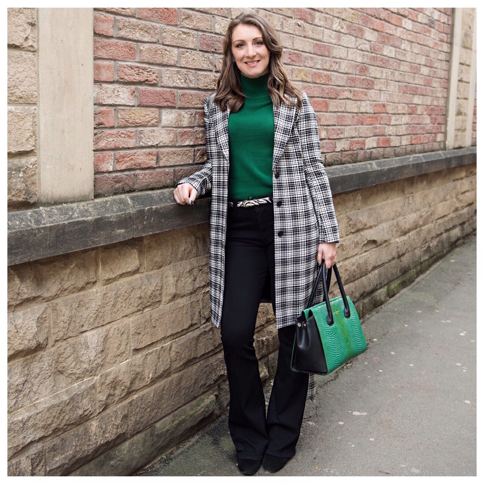 Rowan textured check coat, £115 REISS / Green Harper funnel neck knit, £110 Whistles / Black high waist flared jeans, £136 7 For all man kind / Zebra katie belt, £55 Hobbs / Black block heel ankle boots, £69 Dune / Bethany emerald green handbag, £71 Paul’s Boutique.