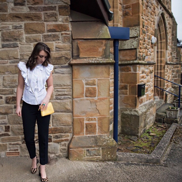 Outfit Numero 1 with this Karen Millen white ruffle shirt is one definitely set for a day time church occasion such as a christening/Baptism/Registry office wedding etc. You don’t always have to wear a dress, it is a formal event but you can still make a fashion statement.