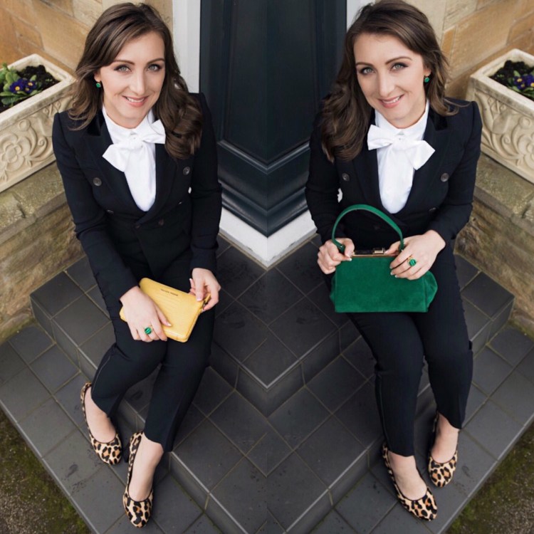 OUTFIT: Velvet detail tuxedo jacket, £99 Karen Millen / Velvet tuxedo trousers black, Karen Millen £60 / The Super Frill Shirt, Karen Millen £115 / Green gold castor ring, Dyrberg Kern £69 / Block heel leopard court shoe, Dune £52.50. / Green gold castor earrings, Dyrberg Kern £45