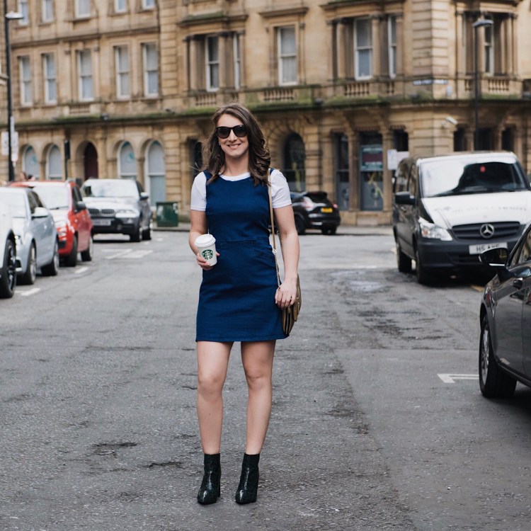 Gold digital clutch bag, £279 Knomo / White Jersey T-shirt, £6.99 H&M / Red hair flower clips, £3.99 Claire’s / Green snake print heeled ankle boots, £35 ASOS / Round-frame acetate sunglasses, £230 Gucci / Denim pinafore dress, Oasis (no longer available)