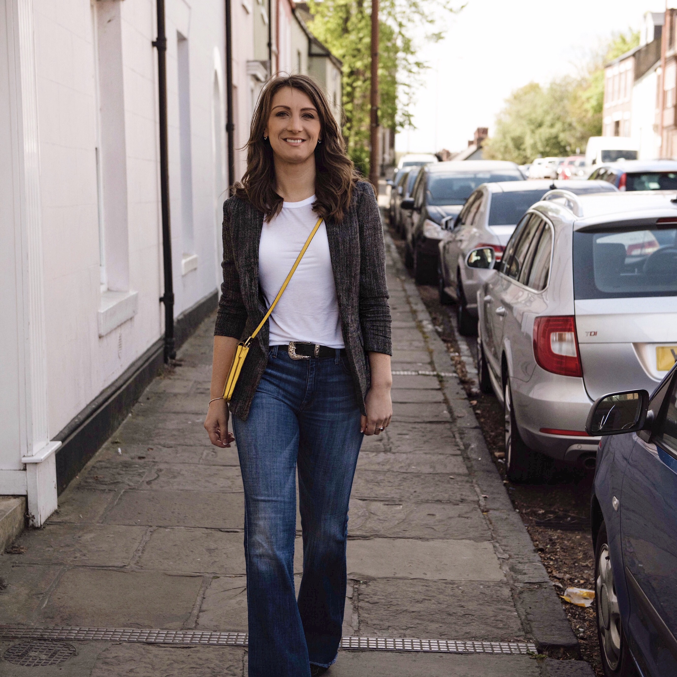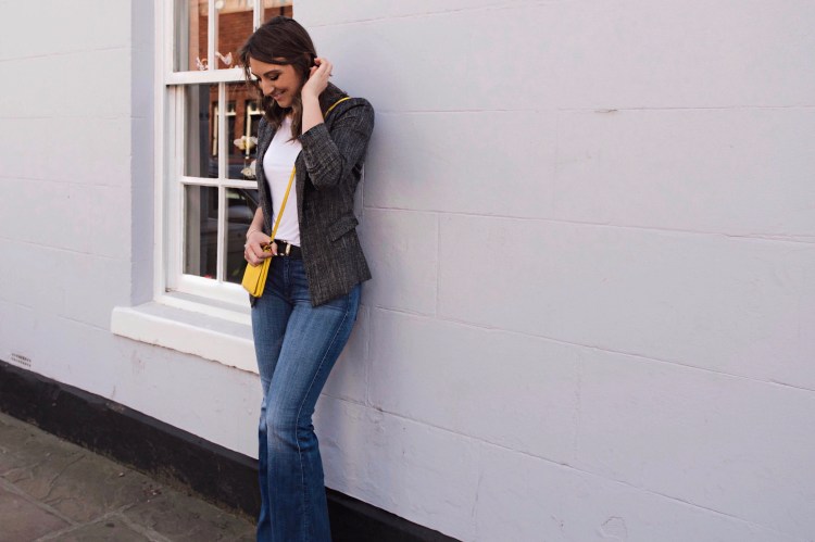 Herringbone Heritage Jacket, £70 Next / Green snake print heeled ankle boots, £35 ASOS / Black silver buckle western belt, £10 River Island / Yellow Keeper saddle crossbody bag, NOW £18.75 Warehouse / White cotton T-Shirt, £6.99 H&M / High waist flare aged jeans, £127 7 for all man kind