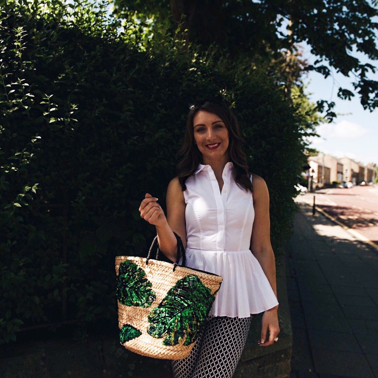 In this first outfit I’m giving it a summer day time feel by adding a straw basket bag, I love the green sequin leaf details (honestly I’m obsessed), Navy patterned cigarette trousers, wedges, wavey hair and rouge lips.