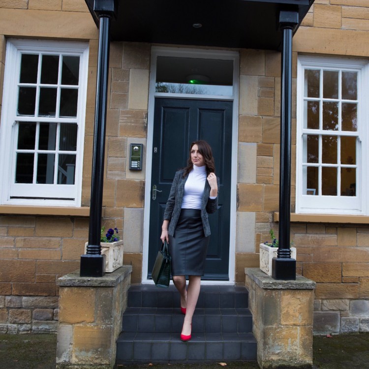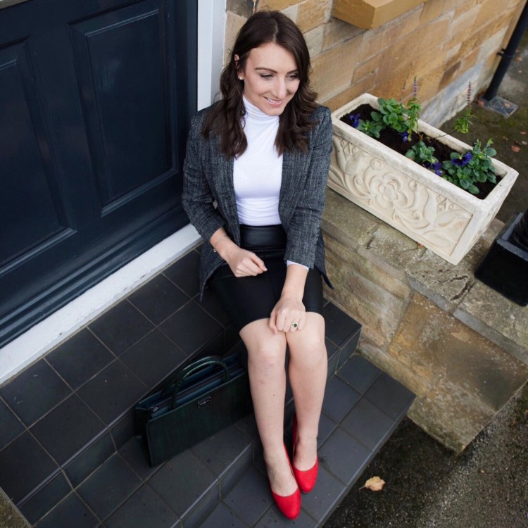 CLICK LINKS TO SHOP: Dark green crock skin hanbag, £72 Pauls Boutique / Dark grey Marl Blazer, £39.99 H&M / Faux leather pencil skirt, £99 Karen Millen / Kendra Red High Heel court, £59 Carvela Kurt Geiger / White silky roll neck, £39 Kettlewell Colours