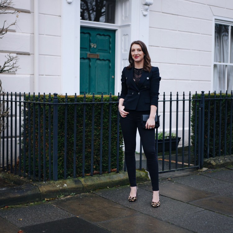 SHOP THE LOOK: Black mesh fitted body, £85 / Tailored boxy blazer, £199 / Black Jaimie Jeans, £40 Topshop / Acapela leopard court, £52.50 DUNE / Faux fur clutch, £65 / Crystal dome ring, £10 Accessorize / Sophia cluster stud earrings, £8 Accessorize