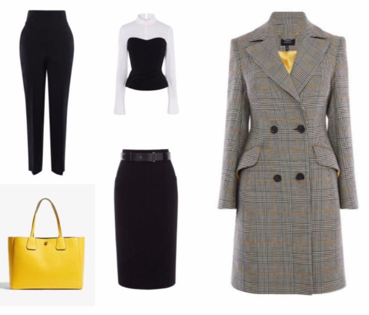 SHOP MY FOREVER FIVE HERE:Yellow Tote Bag, £180 / Corset tailored trousers, £125 / Leather belt pencil skirt, £150 Karen Millen / Corset Shirt, £140 / Double Breasted Check coat, £350 / ALL KAREN MILLEN