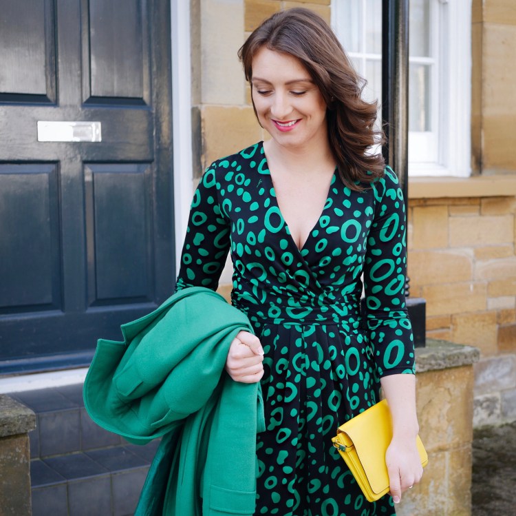 SHOP MY LOOK: Black suedette two part platform courts, £25.99 New Look / ISSA Kate printed wrap dress, £109 / Bright Green belted trench coat, £85 River Island / Yellow Shoulder bag, £14.99 H&M