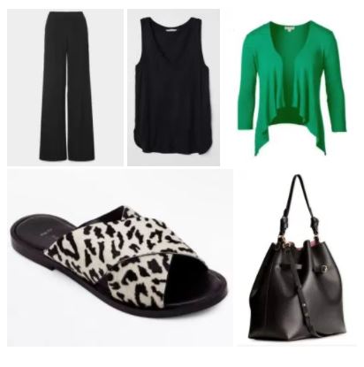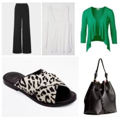 White V-neck Jersey top, £6.99 H&M / Emerald short cascade wrap, £39 Kettlewell Colours / Black Crepe Wide leg trousers, £99 Winser London / Black hobo bag, £24.99 (alternative linked- sold out) / Cream leopard print sliders, £25.99 New Look