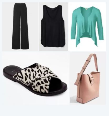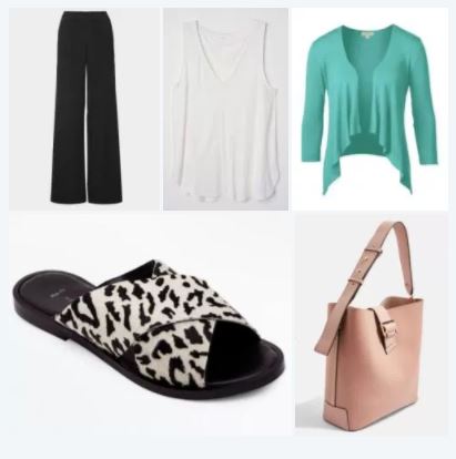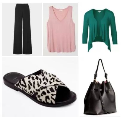 V-neck Jersey tops, £6.99 H&M / Short cascade wrap in Soft Teal, £39 Kettlewell Colours / Black Crepe Wide leg trousers, £99 Winser London / Pink buckle hobo bag, £34 Topshop / Cream leopard print sliders, £25.99 New Look